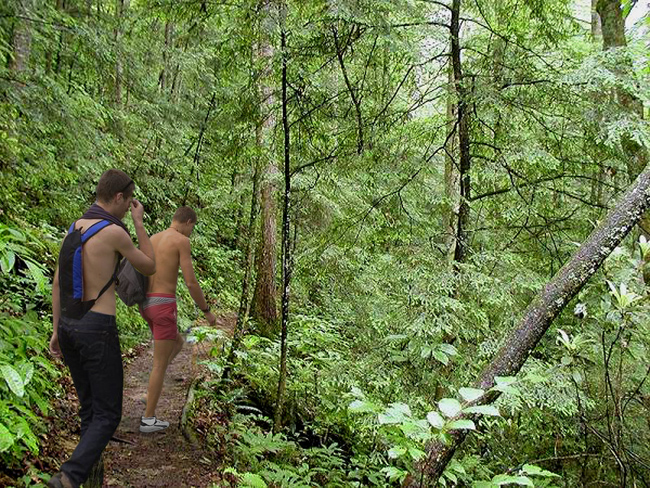 In an effort to cool the sting in his nettle stung behind, Greg stripped naked and dived into a river. Mike undressed and followed him.